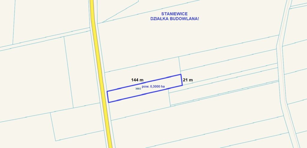 Przedmiotem sprzedaży jest działka budowlana o regularnym, prostokątnym kształcie i wymiarach 144 m x 21 m, idealna pod budowę domu jednorodzinnego z dużym ogrodem i przestrzenią zapewniającą prywatność, a także pod zabudowę o charakterze inwestycyjnym.
